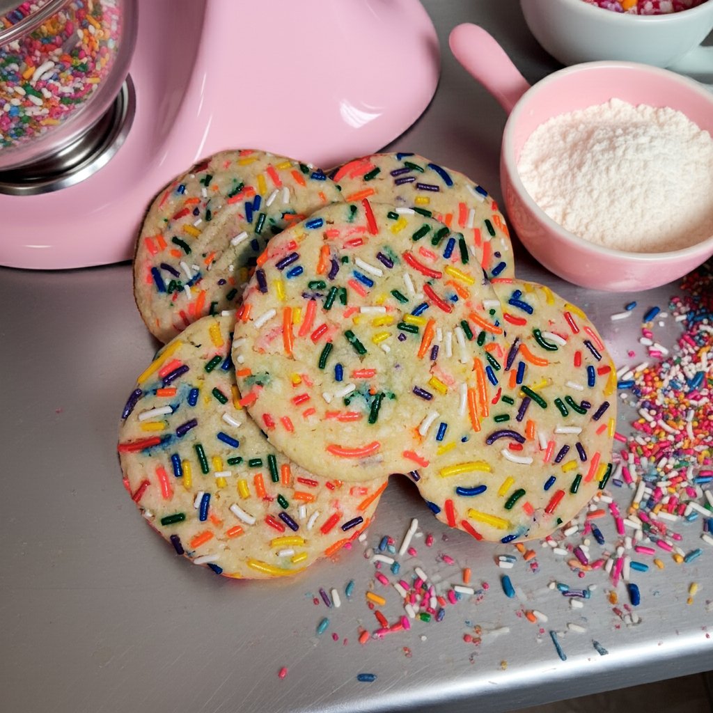 A party in every bite! This soft, buttery sugar cookie is bursting with colorful rainbow sprinkles both inside and out, giving it a festive crunch and a pop of sweetness. With a melt-in-your-mouth texture and a funfetti surprise in every bite, it’s the ultimate celebration treat—no occasion necessary!