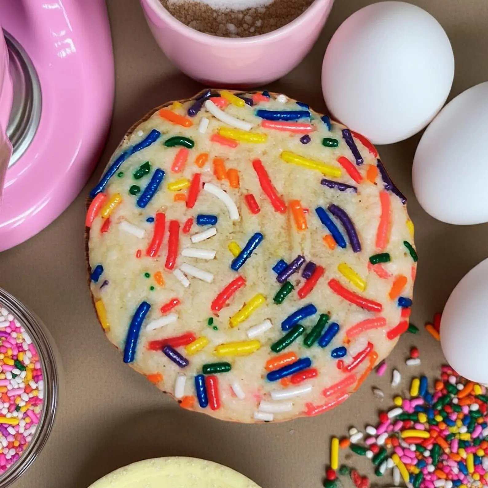 A party in every bite! This soft, buttery sugar cookie is bursting with colorful rainbow sprinkles both inside and out, giving it a festive crunch and a pop of sweetness. With a melt-in-your-mouth texture and a funfetti surprise in every bite, it’s the ultimate celebration treat—no occasion necessary!
